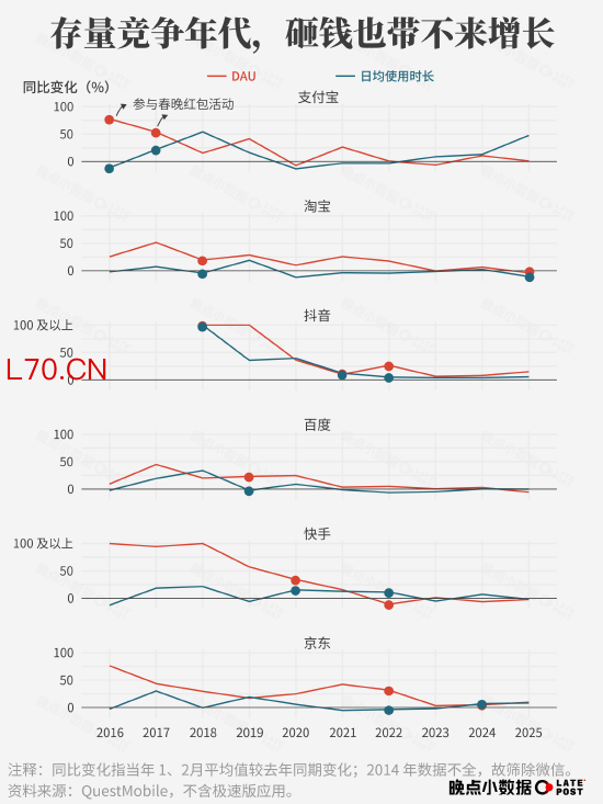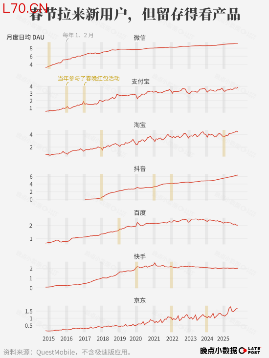 “我们很清楚,春节过后,那些冲高的日活会开始逐渐下降。” 一位腾讯人士说,他们不指望一场春晚、一个春节就能让产品发生质变,但 “防守总好过完全放弃”。一位阿里人士说得更直接:“如果对手靠这些常规动作都能拿到增量,我们缺席就太亏了。”(图文丨贺乾明 黄帧昕 编辑丨黄俊杰)