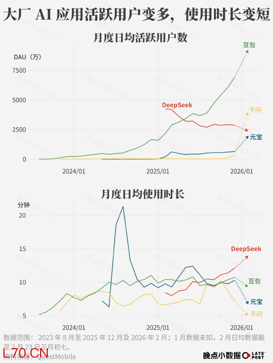 现在的 AI 应用,还没有到微信、抖音当年那样到了快速扩散的时候。春节期间用户平均打开豆包、元宝、千问的时间,最多 10 来分钟,少一些只有 3 分钟——普遍低于 DeepSeek,更不能和 2 小时的微信、抖音相比——不少人打开它们,似乎只是为了领红包。