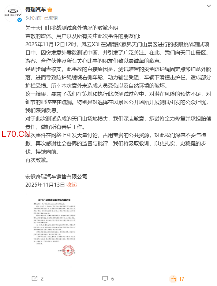 奇瑞汽车就天门山挑战测试意外致歉:将承担赔偿责任,做好善后工作