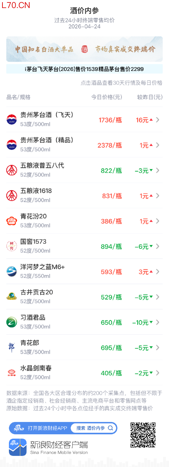 “酒价内参”每日数据源自全国各大区均有合理分布的约200个采集点,包括但不限于酒企指定经销商、社会经销商、电商平台和零售网点等,原始取样数据为过去24个小时各点位经手的真实成交终端零售价,力求为各界提供一份关于知名白酒市场价的客观、科学、全程可追溯数据。随着元旦官方i茅台平台开售1499元/瓶的飞天茅台(3月31日上调至1539元/瓶),1月9日开售2299元/瓶的精品茅台,这一新渠道对两款产品终端零售均价的磁吸式影响力逐步显现。“酒价内参”每日发布的酒价遵循对真实成交量加权的计算规则,我们已将可确量的价格引入两种酒品终端零售价的计算中。